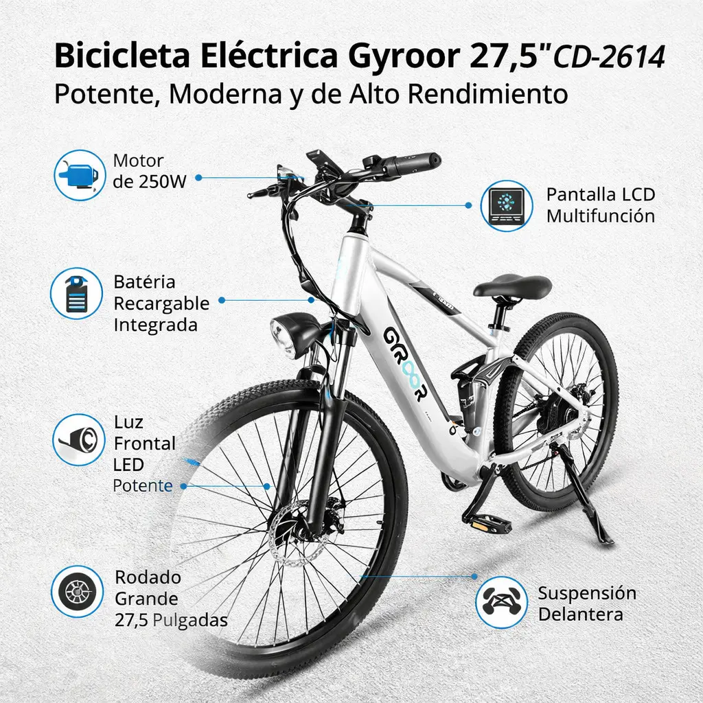 Llevá tus recorridos al siguiente nivel con la Gyroor CD-2614 de 27,5″, una e-bike diseñada para combinar potencia, comodidad y autonomía. Con un motor de 500 W de potencia y batería de 48 V 10,4 Ah, ofrece hasta 35 km/h de velocidad máxima y una autonomía estimada entre 35 y 70 km, según el modo de asistencia. Está equipada con 7 cambios Shimano Tourney, frenos de disco para una frenada segura, y doble suspensión para absorber bien los obstáculos y dar una conducción más estable y cómoda.