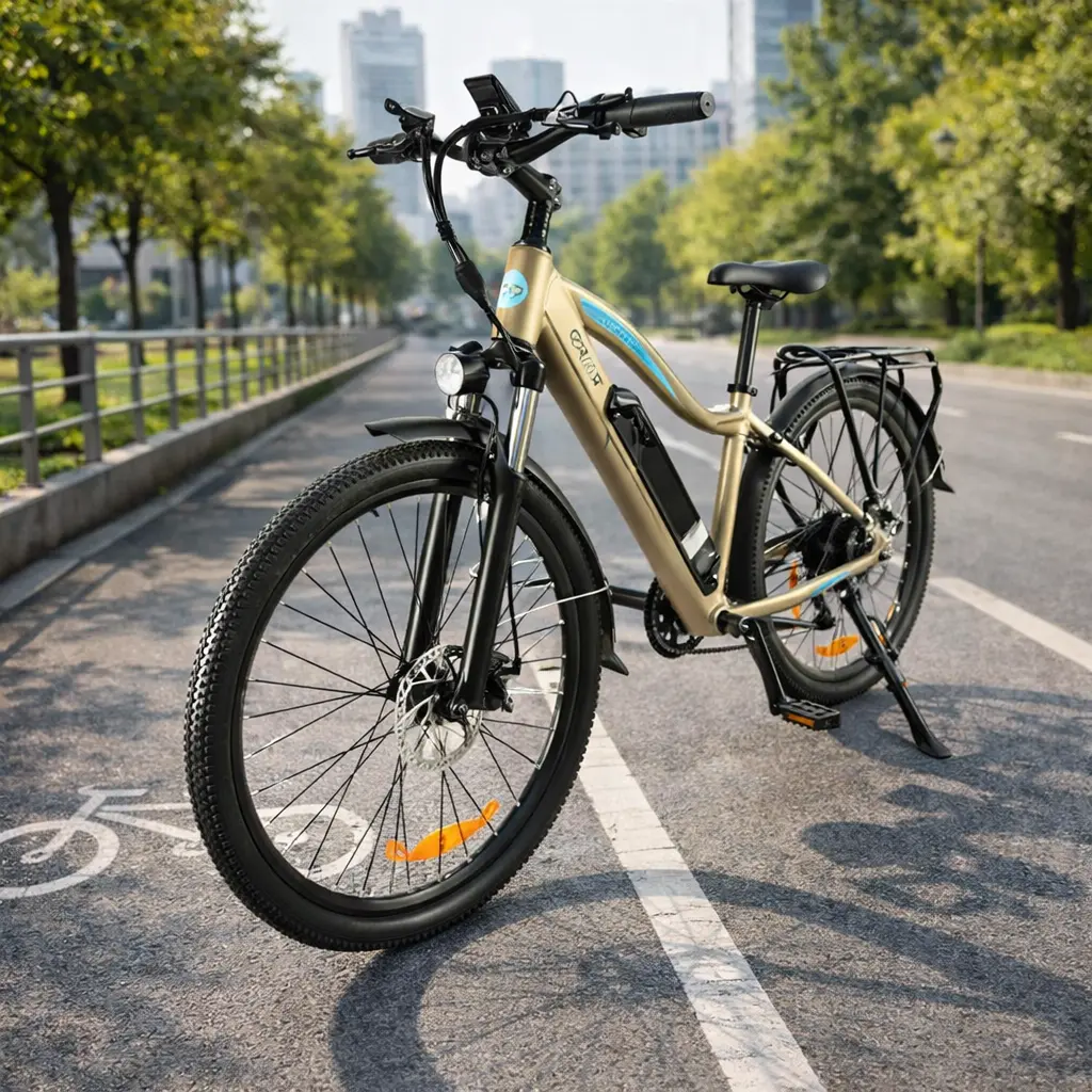 Descubrí una e-bike que fusiona potencia, estilo y autonomía con la Gyroor EB-041. De rodado 27,5″ para una conducción estable y confortable, esta bicicleta eléctrica incluye un motor de 500 W (48 V) y una batería de 48 V 10,4 Ah, proporcionando un rango estimado de 35 a 70 km según el nivel de asistencia al pedaleo. Cuenta con 5 niveles de asistencia, cambios Shimano de 7 velocidades, y frenos de disco para un manejo seguro. Su cuadro en aleación de aluminio le da ligereza, mientras que el llamativo color dorado aporta un toque premium. Además, integra panel LED para monitorear velocidad y batería, luces delantera y trasera, guardabarros, bocina y parrilla, lo que la convierte en una opción práctica para desplazamientos diarios o paseos recreativos.