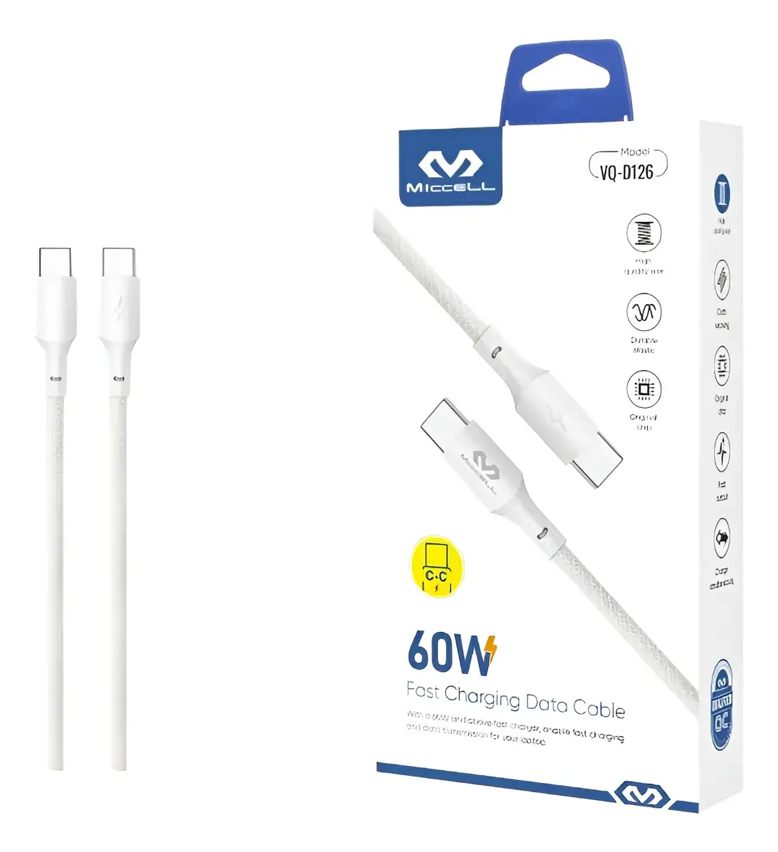 El Cable Tipo-C a Tipo-C Miccell VQ-D126 60W está diseñado para ofrecer carga rápida y transferencia de datos eficiente para dispositivos modernos con puerto USB-C.