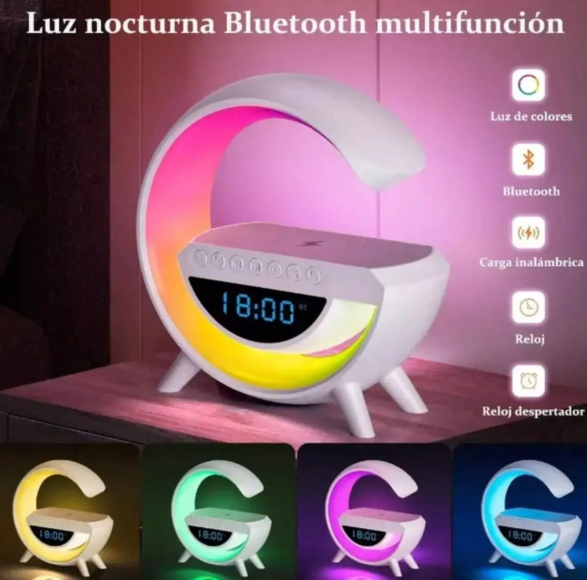 ✔ Diseño moderno en forma de G 💡 ✔ Incluye reloj digital integrado ⏰ ✔ Función de cargador para dispositivos 📱 ✔ Ideal para escritorio o mesa de noche ✔ Iluminación LED eficiente