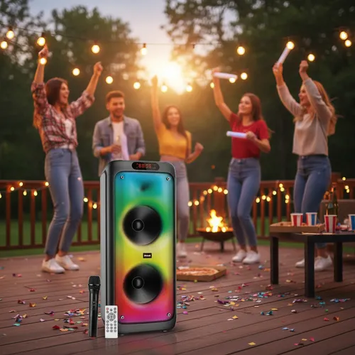 Un parlante de gran potencia con doble woofer de 10″, ideal para fiestas, eventos o usarlo en casa con volumen y calidad.